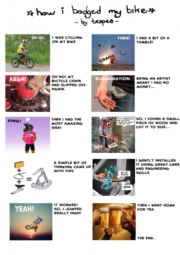I bodged together a chain device. Sick of my front mech and didn’t have the cash for an expensive chain device, I simply chopped a bit of wood, wedged it in place and stuck it on with a zip tie. Bingo! Chain doesn’t drop and I saved myself money on an over-priced bike bit.