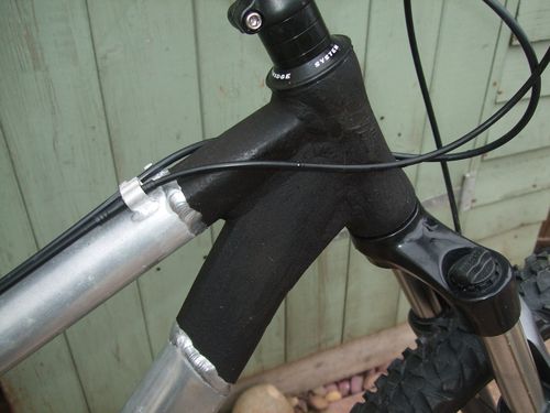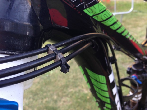 Heres one from Tracy Moseley’s Enduro bike. Her mechanic Ray Waxham has this very neat cable management solution. A cable tie and some plastic tube neaten everything up nicely. I know what I’m doing to my bike next time I have a fettle.