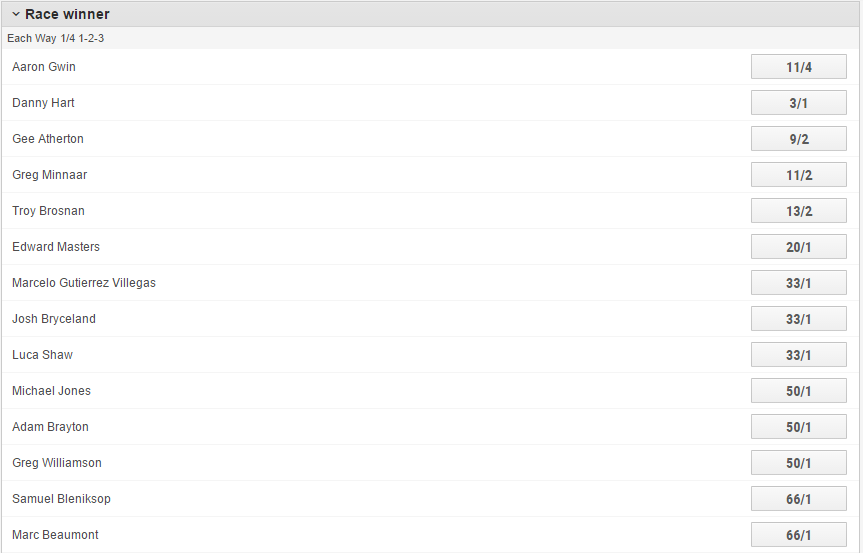 Also tipped highly are Danny Hart and first placed qualifier Gee Atherton who sit at 3/1 and 9/2 respectively. If you want a wildcard pick then Eddie Masters has boosted his odds to 20/1 after his storming qualifying run yesterday.