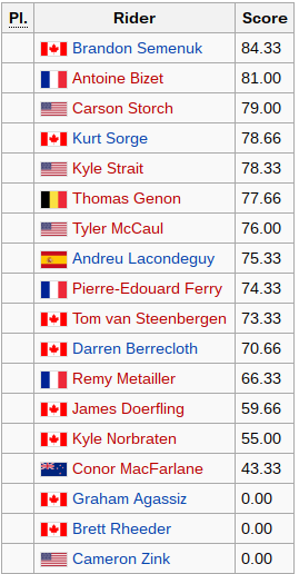 Antoine Bizet (81.00) came second with the first ever double backflip in Rampage history – something he tried and failed last year. This matches his best result from 2012. Carson Storch (79.00) was third.