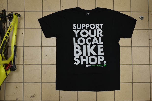 If you’re still not convinced about the need to support your local bike shop then the message on the back of each T might make you think again.