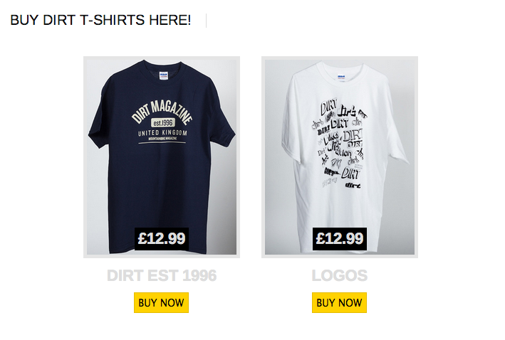 You’ve been telling us for ages that you want to buy Dirt t-shirts. So we’ve done the honourable thing and opened up a shop. Only this one is on the internet super highway not next to the supermarket on the high street.