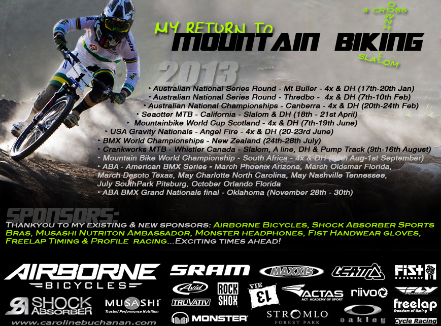 Thank you to my new and existing sponsors and support network for 2013 who have made it possible for me to get back on the mountain bike!