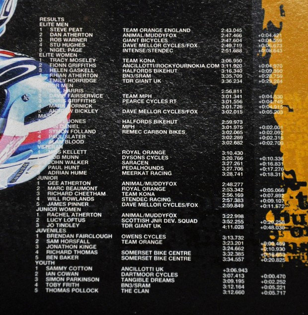 Here’s the results from 2002 from Dirt issue #34. Steve Peat whooped everyone. Gee Atherton and Marc Beaumont were duking it out in the Juniors. Rachel Atherton rules the Junior women. Brendan Fairclough was winning the Juvenilles and Dirt Magazines Steve Jones went round the road gap and still won Masters!