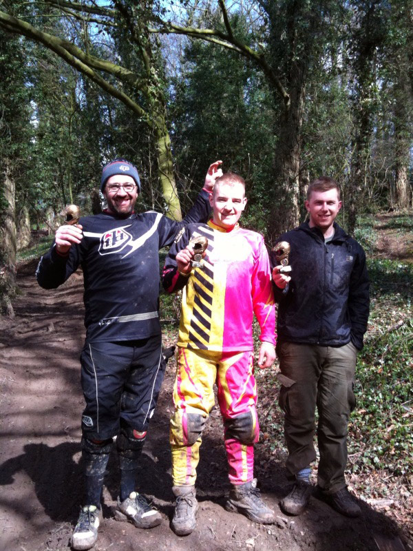 By the thirds the track was completely different, really starting to dry out (ish) giving riders more confidence to pin it through the rock section and the tight berms, and the times showed it. everyone setting quick times except Nath Smith, Neil Farmer and Daz Jordan who decided to check out the wildlife…the undergrowth is coming on well.At the end of the 3rd runs the top 6 were as follows… 1st Rich Batey, 2nd Martin Creaser, 3rd Adam Neesham, 4th Steve Scott, 5th Phil Clarke ,6th Neil Farmer. The banter was in full flow before the fourth runs. We had the banter between the “mekki” lads on who was going to win that battle, we had neil farmer who started well but then faded under pressure,phil clarke giving Nath Smith some stick because he had just over taken him on the previous run and Steve Scott who was obviously quite happy with the placings so far as know one had witnessed him throw his helmet is disgust. The reel banter was at the top though…the odds were flying around the lads to who we thought may pip it. The thing is, Rich Batey is a former pro (and still could be for that matter) so obiously pressure and conditions dont really get to him, martin creaser is the “older” head who seems to always pull it out of the bag and find the smooth fast line when it matters…and finally adam “neesh bender” is fast…the only problem being can he put a run together without hitting a tree,threatening a spectator, bouncing off a rock or generally loosing his head, maybe just maybe.