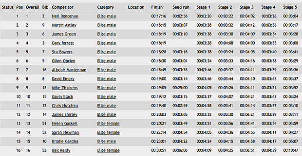 Neil Donoghue set the fastest Elite time over the five timed downhill stages with a 17.16, but Veteran rider Crawford bashed out a 17.12, 4 seconds faster.