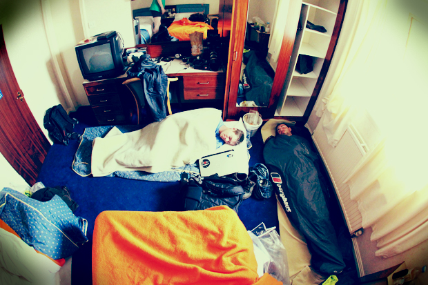 Just to shatter the illusion that life filming World Cups is easy. Here’s a photo of the Parkins and their luxurious Fort William accommodation, sleeping on the hard floor of a norovirus riddled hotel with two smelly room mates for four days.