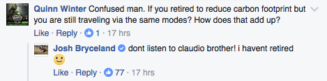 On a photo of Josh next to a truck on Facebook, one fan asked: “Confused man. If you retired to reduce carbon footprint but you are still travelling via the same modes? How does that add up?”