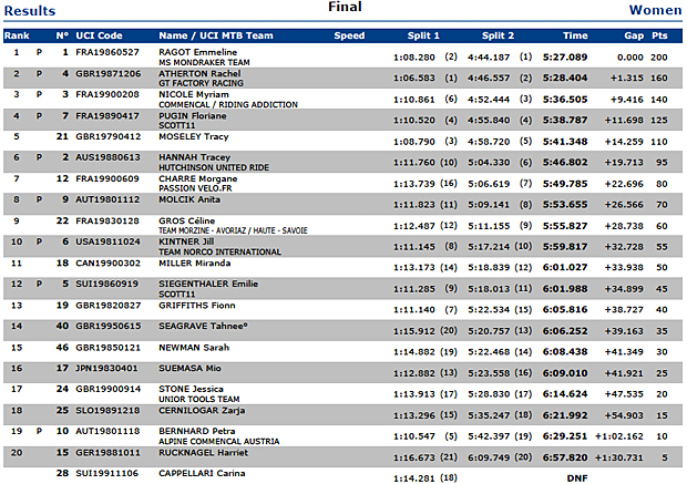 A crash in practice this morning probably didn’t help Rach, but fair play to Ragot, she put in a stormer in pretty atrocious conditions. Also big congratulations to Tracy Moseley for getting on the podium once again despite her semi-retirement.