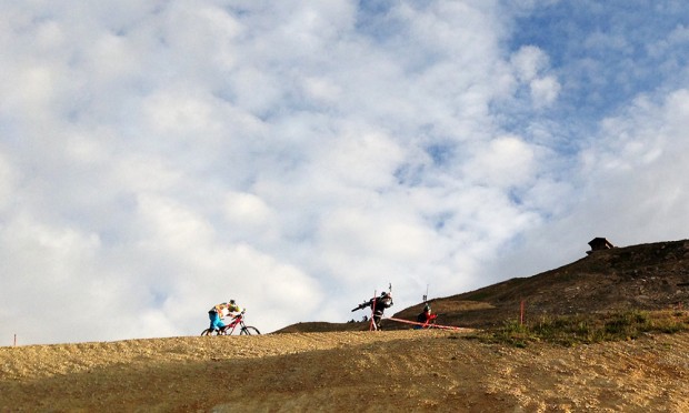 After the early start Stage 1 was raced in the dry with little other than the whisperings of sour weather in the lift queue to fire darts of prediction into the sky. Out of the gondola the riders were greeted with a climb, about 200m vertical distance in a few short twists up the loose rocks that form the base for a steep ski piste. No one was daft enough to ride up this, instead it served as a wakener/weakener after a sleepy trip up the lift.