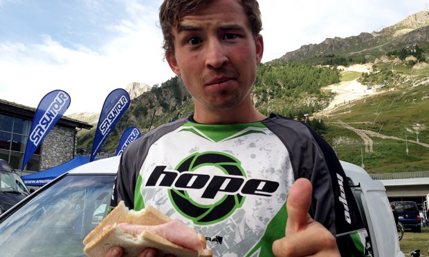 With Stage 1 dusted the riders had the opportunity to grab some food and drink before they were back in the gondola heading for Stage 2 practice. Hope rider Sam Flanagan knew the score with Enduro nutrition, ham butties!