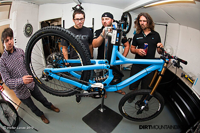 Last week (Aug 19-20th) Nico Menard from Commencal in Andorra, flew over to the Atherton family HQ to try out the new frame. The team’s mechanics carefully built the new frames up into complete bikes, and of course the all–important team stickers were applied. As we said, the full story will be appearing in the magazine, but for now here are some photos.