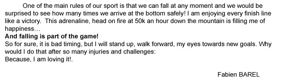 I’m sure by now you’ve all seen or at least heard of Fabien Barel’s fairly horrific training injury. Few of us get through the year without at least one heavy knock. Now you can read Fabien’s account of what happened and take inspiration from his attitude towards it. There’s nothing more to say really, so just read this…