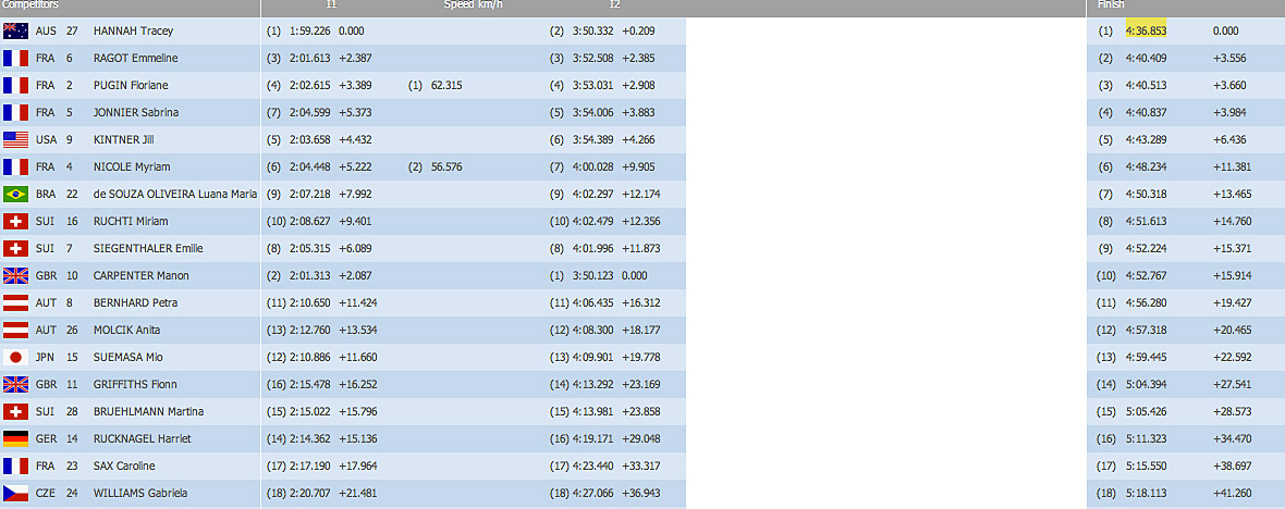 Manon Carpenter was on an absolute flyer, fastest at the first two splits until Tracey Hannah went quicker.