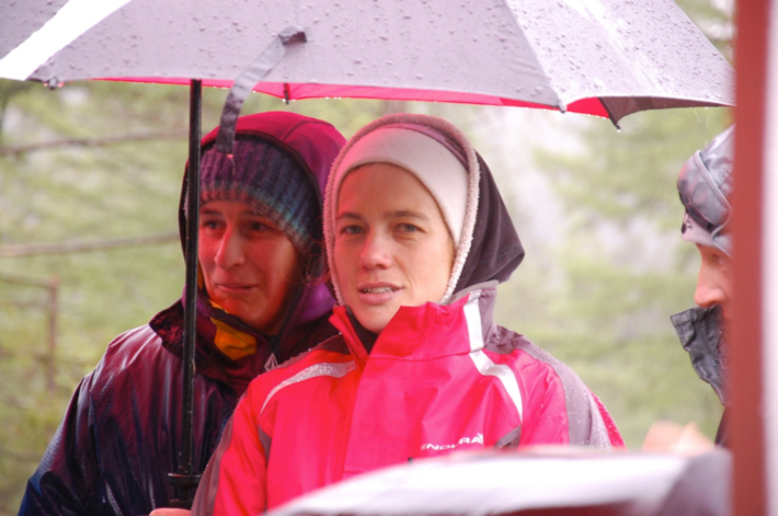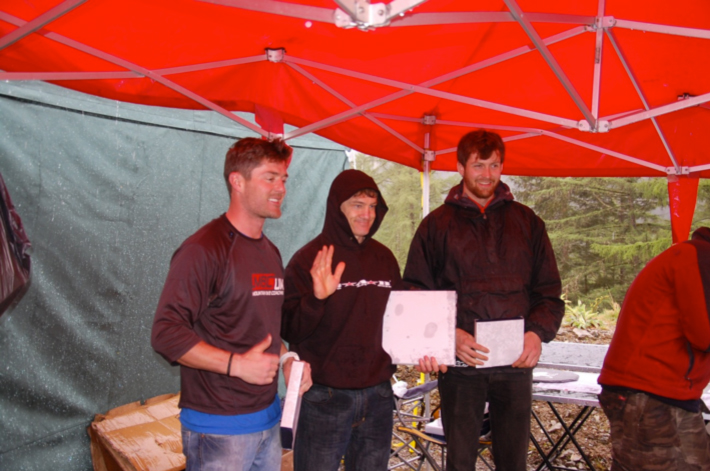 The rain didn’t let up after the race, so no surprises that most people were on their journey home by the time podium presentations were held. A number of people were huddled out of the rain checking the timing screen and speculating who had won, but it only showed individual run times and not the overall result. Judging roughly it appeared it would be close between Rob ‘Box’ Cooksley (opting to run a 29er Intense bike) and fastest in seeding Alex Rafferty.