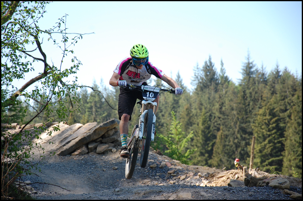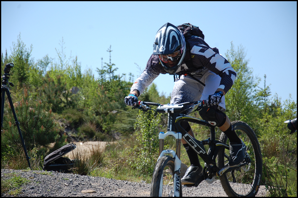 Stage 4, the most technical of all. Start on the big 4X start hill, take in the first step down double and then launch off the right hand side of the second double into root and stump infested singletrack. Picking up speed in places here you had to try to find the smoothest way through the terrain, cross a road and into the trees, again littered with stones and stumps before a steep tricky left hand corner before crossing another road. A slippy right hairpin and then the trail straightened up and sped up with a number of natural gaps and double jumps before two hairpin corners and cross the finish.
