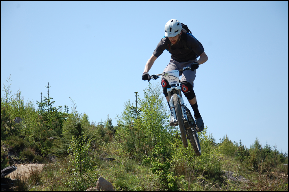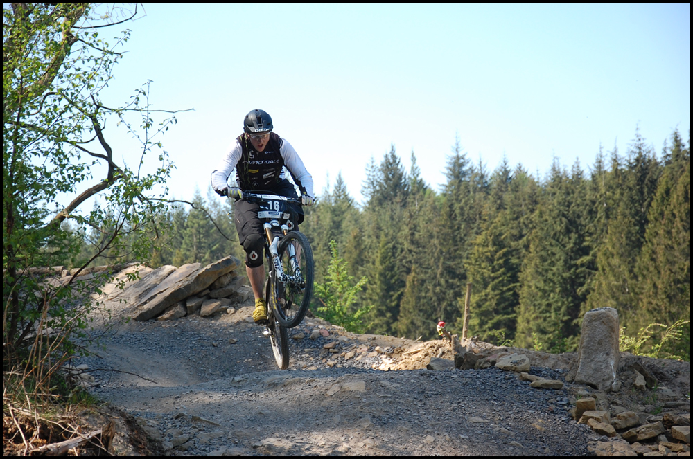 Stage 3, following a section of Hamsterley’s red trail here, well established and flowing yet when pushing at race pace it was a fine line of how hard you could rail the corners with slight berms but wouldn’t hold you if you over cooked it. Midway and you joined a fireroad with a proper climb in it, steep to begin with you had to keep rhythm over the top and maintain pace before re entering the trail. Again more flowing corners before picking up speed over rocks and a wooden drop before the finish.