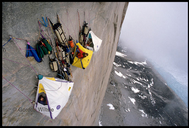 The shot of the tents hanging on the cliffs was a National Geographic commission and he apparently had to swing on a rope out from the cliff.
