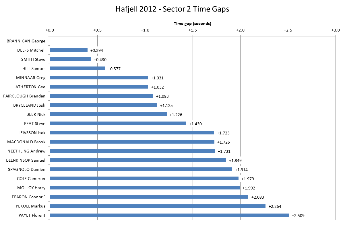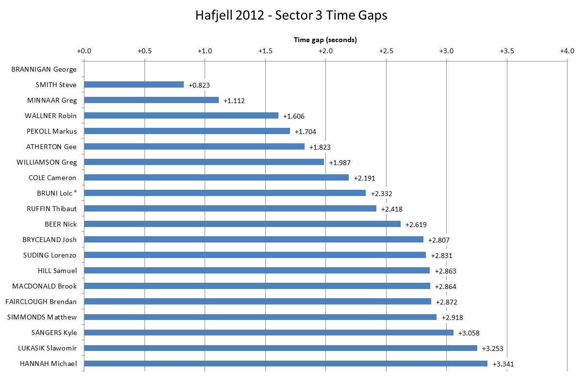 Into the final Sector and Brannigan ate further into Steve Smith’s advantage, going over 0.8 seconds faster than Smith. This looks even more impressive when you consider the gap from Smith to Mick Hannah in 20th place was only 2.5 seconds. Ultimately though, Brannigan left himself with too much to do after giving away over 1.6 seconds in the first sector. Greg Minnaar managed to cement his second place overall with a final sector time that was 0.7 seconds faster than Gee Atherton.