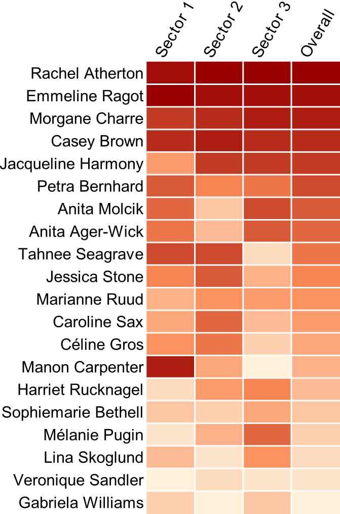 On the heatmap we can see the consistency and speed of Ragot and Atherton – monopolising the top 2 positions throughout. Brown and Charre shared out the 3rd and 4th places but Jacquleine Harmony might wonder what happened in Sector 1 with only 12th fastest. Anita Molick and Anita Ager-Wick lost out in Sector 2 with 16th and 15th respectively whilst Seagrave’s Sector 3 stands out as the reason she dropped down to 9th overall after a good first two-thirds of the race.