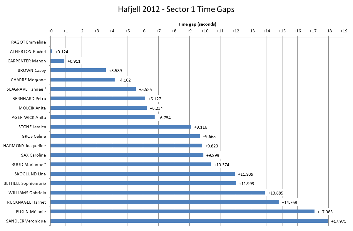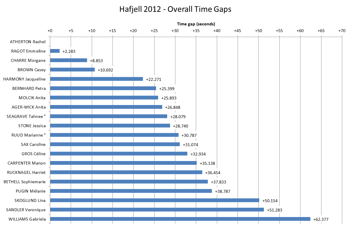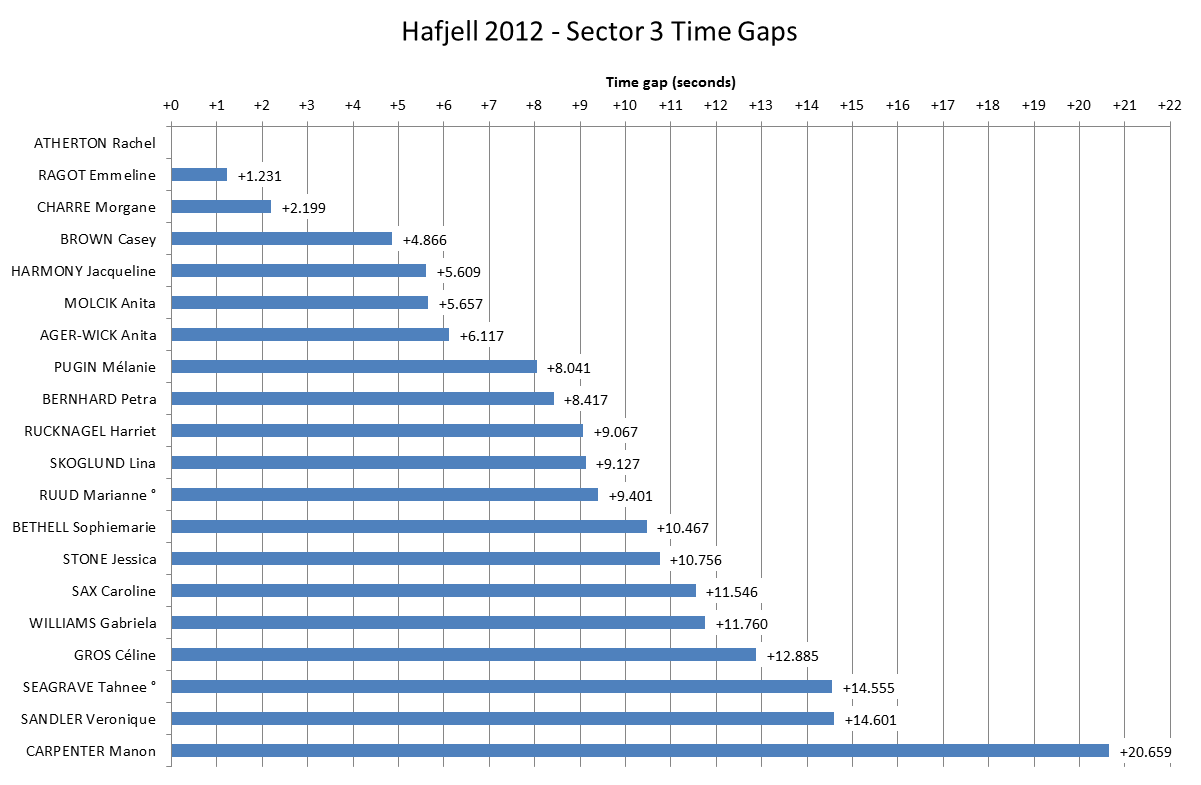 So this is it, the final chance to Look At The Stats! for the 2012 World Cup season with the Women’s race from Hafjell. What a finale it was! Unlike the Men the overall Women’s race went right to the wire but Rachel Atherton held off Emmeline Ragot to take the win and the overall despite missing Round 1 in Pietermaritzburg. Ragot would have been desperate to beat Atherton and take the overall but where was it won and lost?