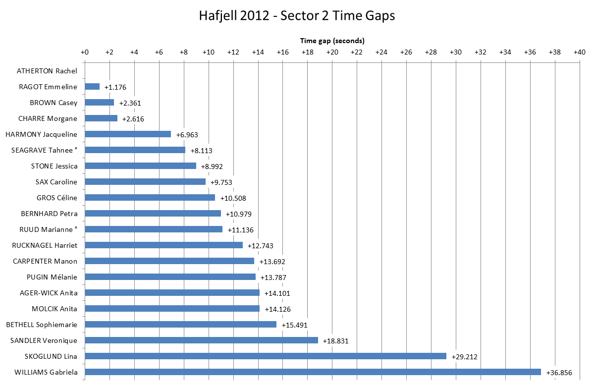 Times were a lot tighter in Sector 2 but crucially Atherton managed to wipe out her deficit with the fastest time – 1.2 seconds faster than Ragot. Charre and Brown were leading the chase about 2.5 seconds back. By this point Brown had a 0.8 second advantage over Charre in the battle for 3rd place. Tahnee Seagrave was having a great race at this point placing 6th in both Sector 1 and 2.