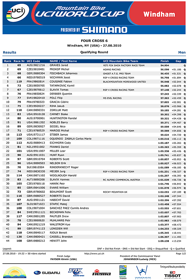 Only 32 qualifiers this time instead of 64 in the mens 4x (only 50 were entered). Graves came out on top. DH rider Fabien Cousinie in 5th and that man Gracia again after his 10th in DH qualifying earlier in the day gets another 10th in 4x. Scott Beaumont had a bad day at the office and got in by the skin of his teeth in 32nd.