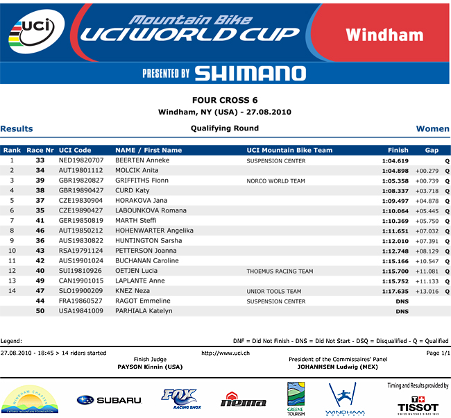 The Beerten and Molcik battle continues. But expect Fionn Griffiths and Katy Curd 3rd and 4th respectively to be right in the mix in the finals. Current World Champion Caroline Buchanan 11th in only her second WC this year.