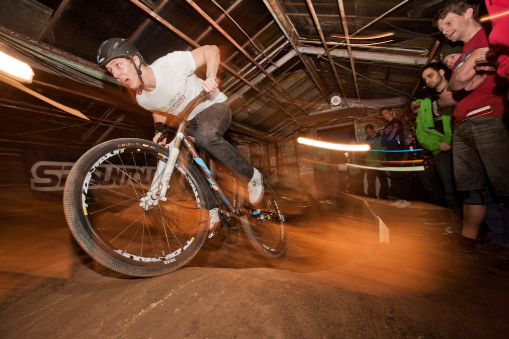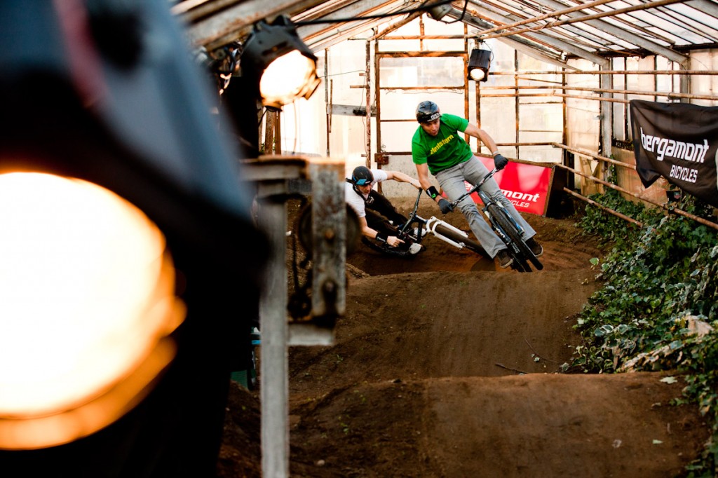 On Saturday, 14th January a pumptrack race with a top class field was held in Ostermundigen, close to Bern. The scene was a greenhouse, more than 70 years old, in the heart of the Kiener market garden. In the early afternoon, a fine selection of gravity riders from Switzerland and Germany arrived to get a feel of the course for the evening’s race. Amongst the riders invited were some well-known names such as Roger Rinderknecht, Nick Beer, René Wildhaber, Guido Tschugg, Timo Pritzel, David Graf, Rob Jauch and the retired under23-XC world champion Balz Weber. In total, 26 riders signed in for the qualifying.