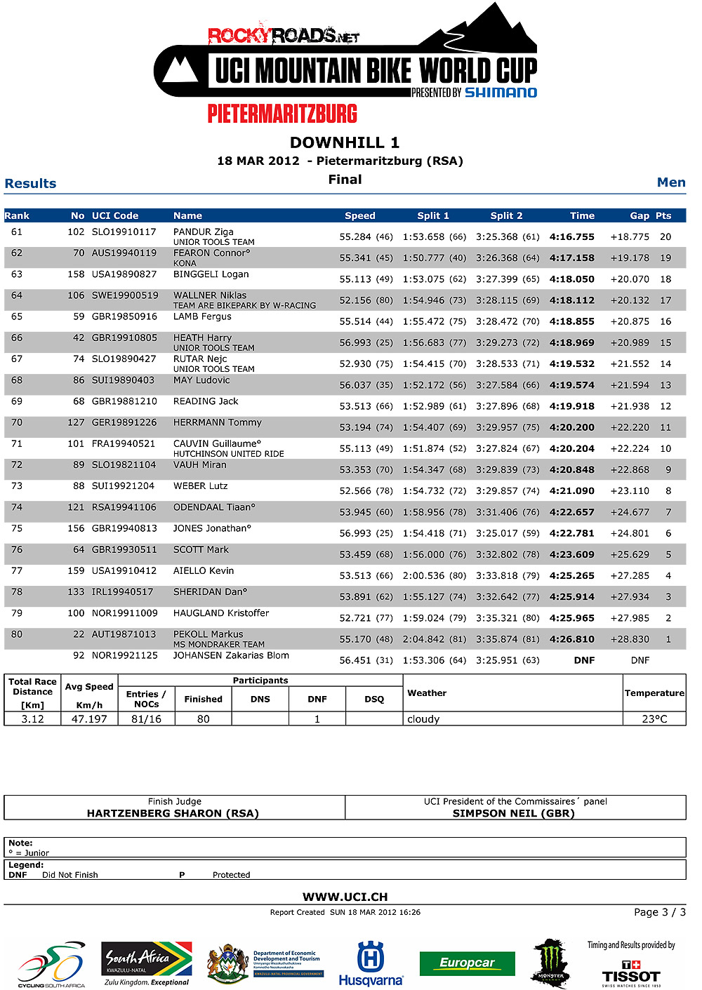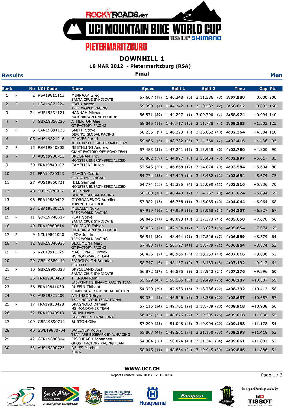 The win was an emotional one for Minnaar, who has been spending much of the past fortnight at his father’s side in intensive care at a local hospital. His team gave him licence to withdraw from the season-opening UCI MTB World Cup. However at his father’s insistence he opted to race, and set up an online facility in his hospital ward to enable him to watch the internet-streamed live coverage of the race.