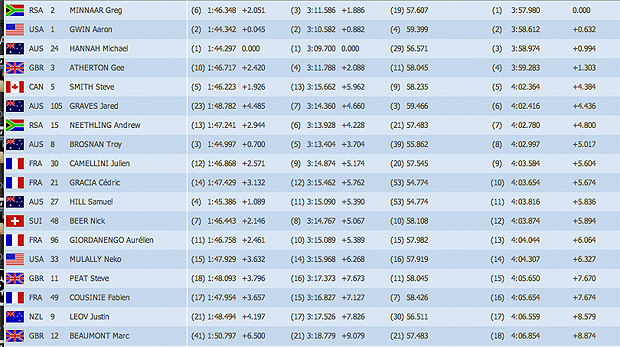 However 30 year old Minnaar, who won here in 2009, had to dig deep over the tough final third of the course to make up two crucial seconds to finish six tenths of a second faster than Gwinn, sending the crowd into raptures.