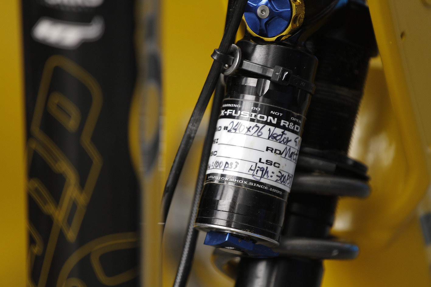 Also on the bike is mk2 of a new prototype Vector rear shock from X-Fusion’s R and D department that the guys have just recieved before this weekends BDS in Fort William, the shock hosts some new technology with a low and a high pressure air chamber which makes for a minimal break away feel and an adjustable ramp up platform.”