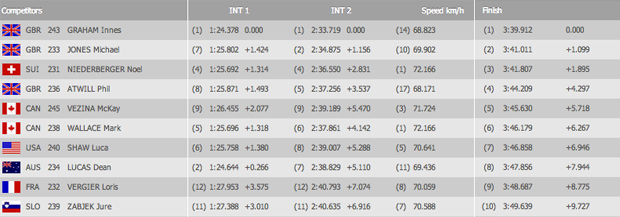 After crashing out hard in practice Loris Vergier who was been flat out quick all year is back in 9th position. Ines Graham takes the top spot and put a 1.099s gap into second placed Mike Jones. Scott rider Noel Neiderberger sits between Jones and 4th placed UK rider Phil Atwill from the Madison Saracen Team.