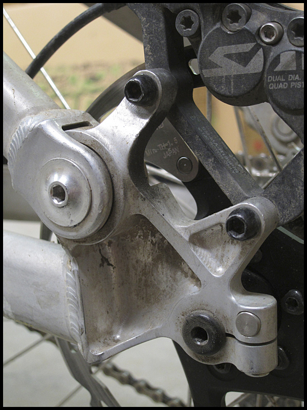You noticed. We are using very large bearings and aluminum axles at every pivot. The main pivot and rocker pivot use the same bearing, an 6903-2RS1 with 17mm inner diameter, 40mm outer diameter and a width of 12mm. The chain stay to seat stay and seat stay to rocker pivots use 66200-2RS1 which has a 10mm inner diameter, 30mm outer and 9mm width. You’ll notice that the pivot bolts for chain stay and rocker pivots are in double shear. This feature adds a bit of complexity and cost to the frame but it greatly increases frame stiffness and bearing life.