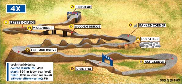 The 4X track has been designed by racer Guido Tschugg  and will be pretty mental if it looks anything like this in the flesh! Not a big vetical drop but there should be plenty of speed and overtaking if we are lucky.