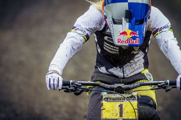 Rachel Atherton is comfortable at the top of the women’s field with a 160 point gap back to Emmeline Ragot. The clincher is Manon Carpenter, so hungry for a win she will be looking to devour the 45 points between her and Ragot and take a step up the podium for the overall. Do the maths and it isn’t over, but on her current form it would take a nightmare result for the title to be taken from Rachel. She has been solid all season and there’s a good chance she will make it stick for the overall. It’s not often you see the series leader vest covering up a World Champs jersey. Barring any screw ups she will be adding the overall title to the cabinet back in Llangynog next week.