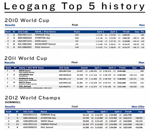 Minnaar is out of the title race, even if he landed the top spots in both qualifying and finals he would still be short of the overall. However, he is strong here and could upset things at the top. He won Worlds here last year, 3rd in 2011 and another win for him in the 2010 World Cup shows that this track suits him. Greg can go fast here but it will only serve to tighten the gap between Atherton and Smith rather than shift them from the top two steps.