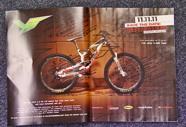 Seen the YT Industries advert in the opening pages of Dirt 117? Well somebody just reminded me that tomorrow (which I call Spinal Tap day) 11/11/11 you can buy the YT Industries Tues DH LTD WC bike for the unbelievable price of 2888 Euros or about £2469 quid.
