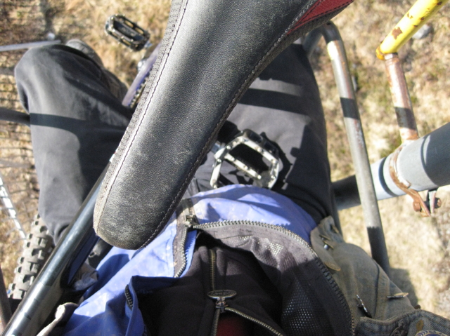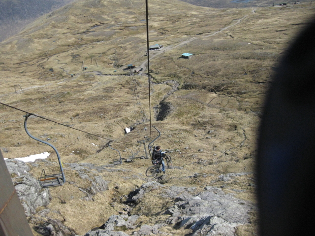 Over the hump and drop down to the single chair lift. This was interesting as its not geared to carry bikes, and that is a V12 resting on my tackle taking the weight of the bike, i was too excited to notice the pain as i have never been on a chair lift or this high up before.