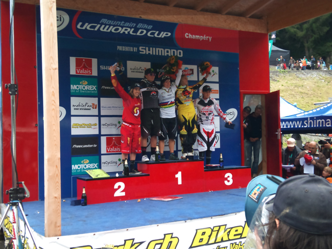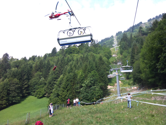 The hill at Champery was sooo steep my legs were killing me from walking the track. The organisers had a chopper on standby during all of racing and practice, instead of trying to stretcher injured riders out they went in with the chopper and a winchman to pluck them out, dropping them into the fields at the bottom for medical attention. This was alarming at first but was a good service. Wouldn’t have been much fun walking down with a broken collarbone or a concussion.