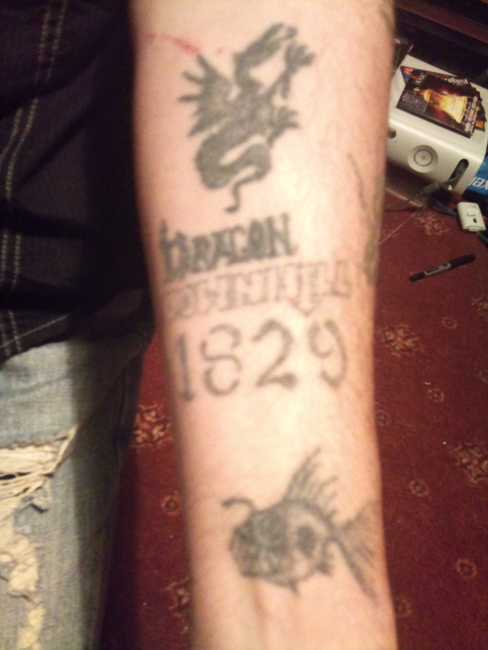 I also hooked up with one of my old time buddies from the early Dragon Downhill days, Jeremy Wyatt, and finally got a picture of his Dragon tattoo. The Dragon logo is one I stole from a tattoo parlour in Merthyr back in 1998 to use on the first laser cut trophies. The numbers are the time it took Jeremy to finish his first Dragon race which was at Mountain Ash, I think it involved banging his head a couple of times and sitting on the floor for a while. Anyway, it was Jers first Dragon race and it meant a lot to him.