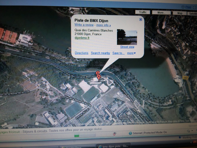 As usual when we visit Europe we seek out a few BMX tracks along the way to break up the journey. This time we hit Dijon and used the intergoogle to find the facts. We went to two tracks, one out of town that was used for the French National champs and one in the centre of town, location shown. When I was chatting to one of the Marshals in Champery it turned out that he used to use the one in town when he was a kid alongside non other than Anne Caro Chausson herself. We got real sweaty riding both tracks in the midday sun then cooled off in Dijon Plage for a swim, a snooze, then back on the road.