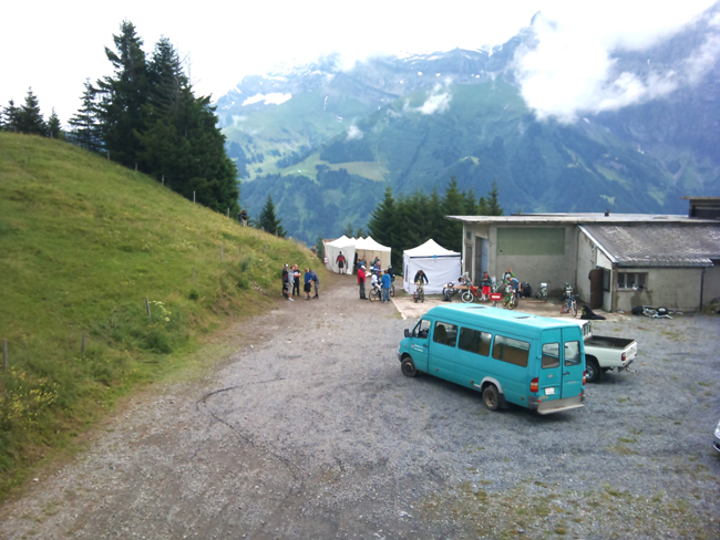 Wednesday was sign on and track walking so we all had a well deserved lie in. We shared our Chalet with Ollie Burtons mum Sue so they turned up Tuesday morning. At sign on we were told that there was no provision for privateers without prebooked pitches (like 500e’s) and we would have to pit from the Champery Village 2km away…..Like, sure we could do that!! We found a spot in a little field close to the venue with the rest of the poor privateers and left the van there for the duration of the event. When it rained it was completely stuck there anyway. When will these organisers realise that it’s the privateers that are the roots of UCI World cups and make some provision for them??? Bonkers