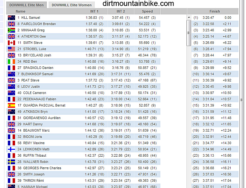 Riders are still coming down but its safe to say it’ll be a Monster Specialized one/two with Hill and Fairclough at the moment. Dirt Norco rider Ben Reid had a flier for 8th. Bryceland aiming for his first podium in 7th. Stevie Smith and Luke Strobel also enjoying the conditions. Spagnola doing it for Mondraker in Barels absence.
