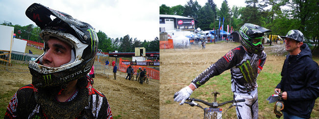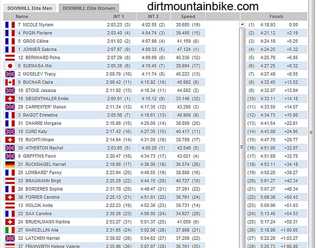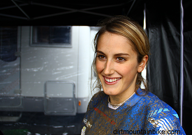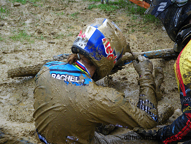 In the womens flat pedal rider Myriam Nicole leads the way. Rachel Atherton had an almighty spill while trying to clear the last double. With her broken finger she just couldn’t hold on to the bike as it came up short. Tracy Moseley took it easy after a big scare on the first jump in the fog. Sabrina Jonnier wasn’t happy with her run either.