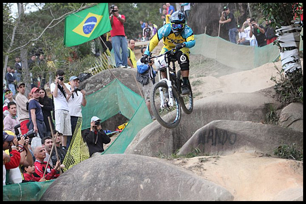 The course in Brazil was the same track as the 2006 UCI World Cup – built by Brazilian world cup racer Markolf Bercholds father (Brazils answer to Scotland’s Peter Pollock). Apparently, it took 6 months to clear the land and construct, and what a grand job he did. The course was around 2 and a half minutes long, a fast and technical track with loose unpredictable dusty off camber, rooty sections, drops and doubles.