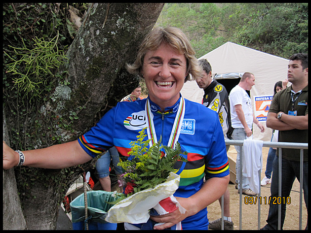 Petra (Peaches) Wiltshire (UK) took the championship title in the womens 40-50 cat and nailed an astounding ‘hat trick’ of rainbow jerseys – three championships wins on three continents in three categories over the years.