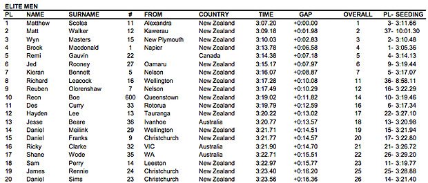 Matt Walker (Kawerau) set the benchmark time from a deep seed position, and Wyn Masters (New Plymouth) locked in his best result of this summer with a third. Only Alexandra’s Matt Scoles had the pace to better Walker’s time. Scoles, who raced a quality season in Europe last year that saw him finishing in top ten positions during late season World Cups, and winning everything he raced at the next tier of competition in Italy has been on a steady upward rise in this sport since working his way back from injury after his 2007 Junior World Championship bronze medal.
