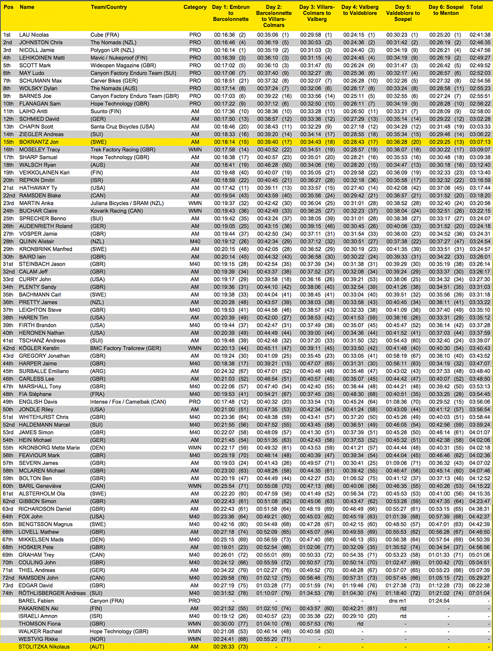 DAY 6 STAGE RESULTS