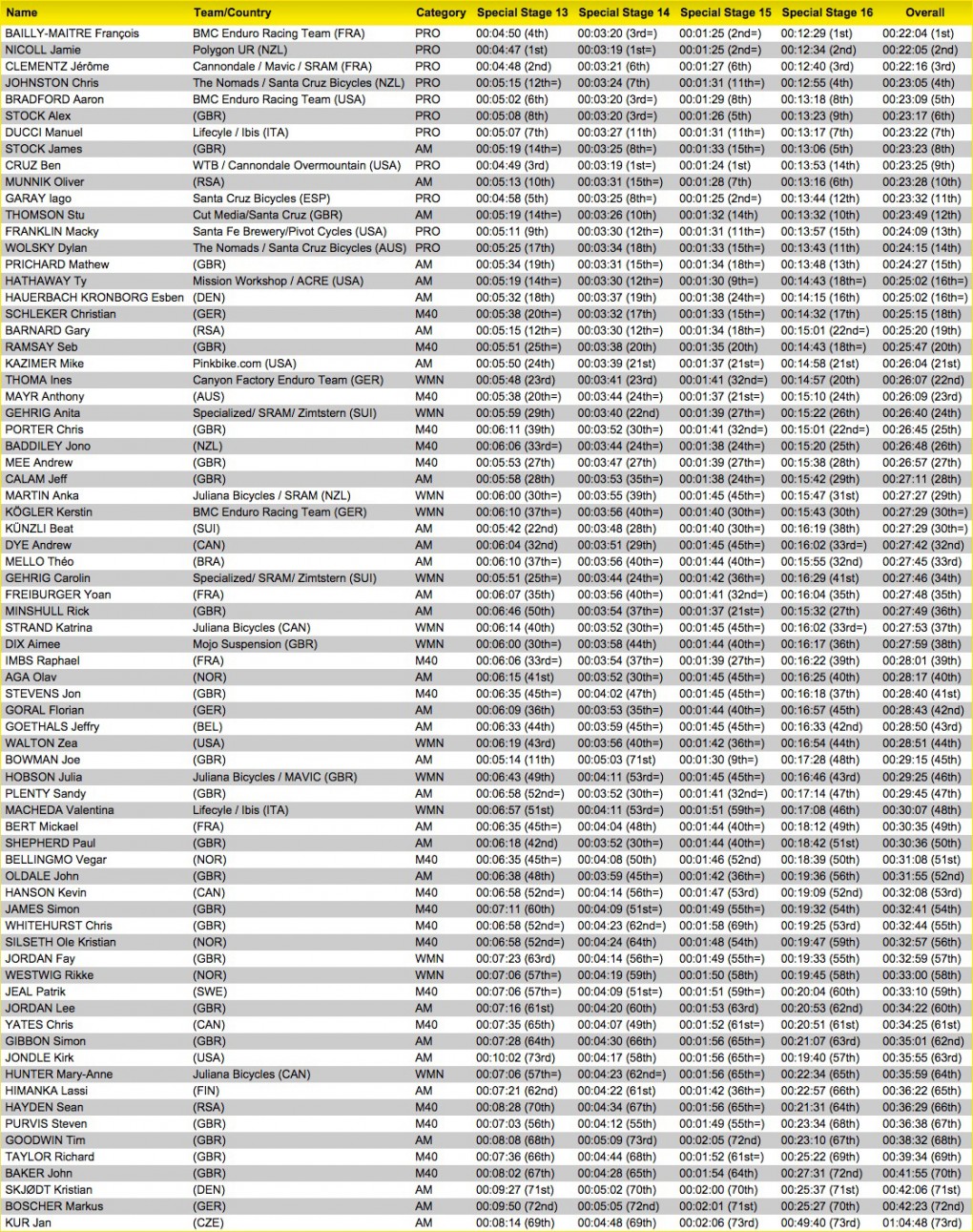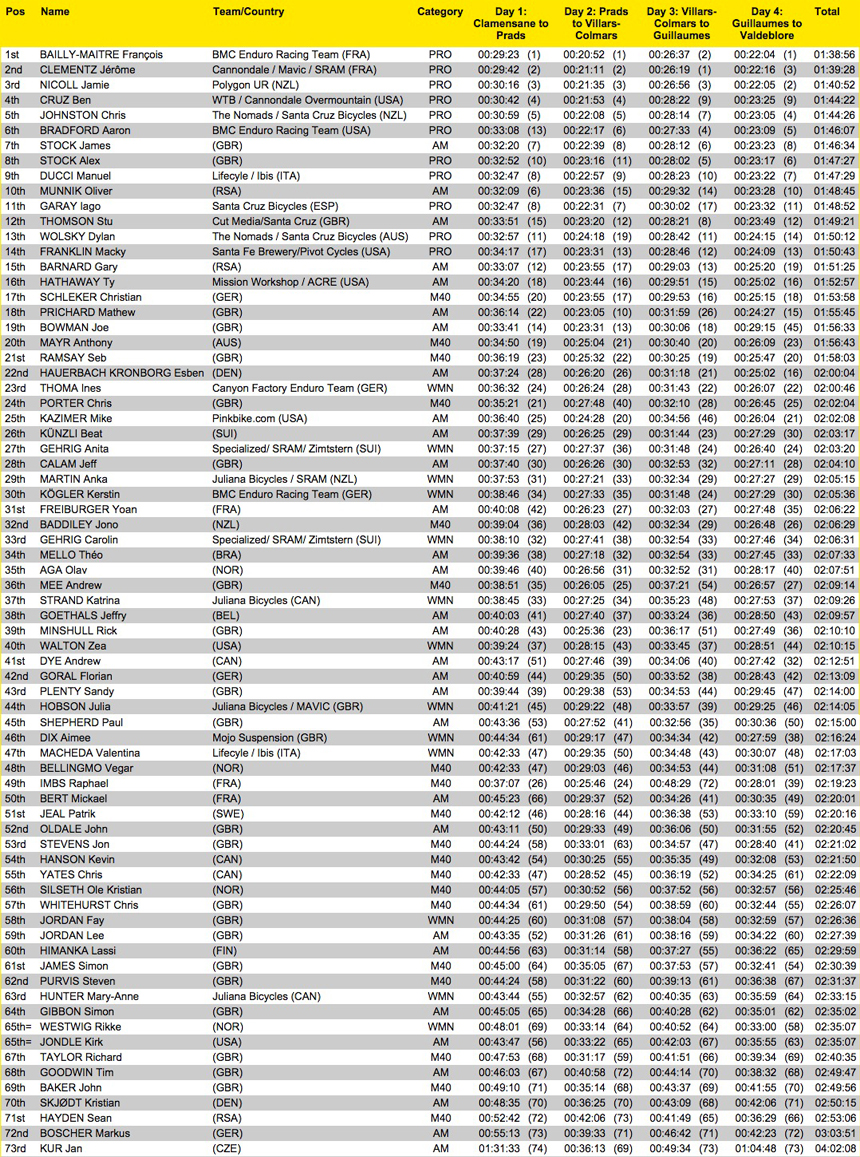 Setting out the riders were faced with some steep technical climbing over roots and rock to get to the top ready for the first stage of downhill. The uphill effort was rewarded by a wake up call through some rocky descents before a final liaison stage for a few beers at the finish. The race is still being led by Francois Bailly Maitre, Jerome Clementz in second with Jamie Nicoll in 3rd. Ben Cruz and Chris Johnston round out the top 5 with the two Stocks now in 7th and 8th. The top women remain unchanged too with Ines Thoma out front, Anita Gehrig in second and Anka Martin third.